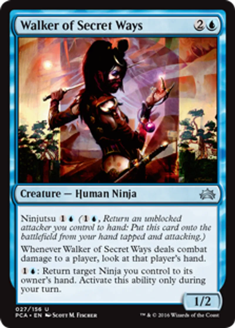 | Oracle Text | Ninjutsu {{1}}{{u}} ({{1}}{{u}}, Return an unblocked attacker you control to hand: Put this card onto the battlefield from your hand tapped and attacking.) Whenever Walker of Secret Ways deals combat damage to a player, look at that player's hand. {{1}}{{u}}: Return target Ninja you control to its owner's hand. Activate this ability only during your turn. | ||