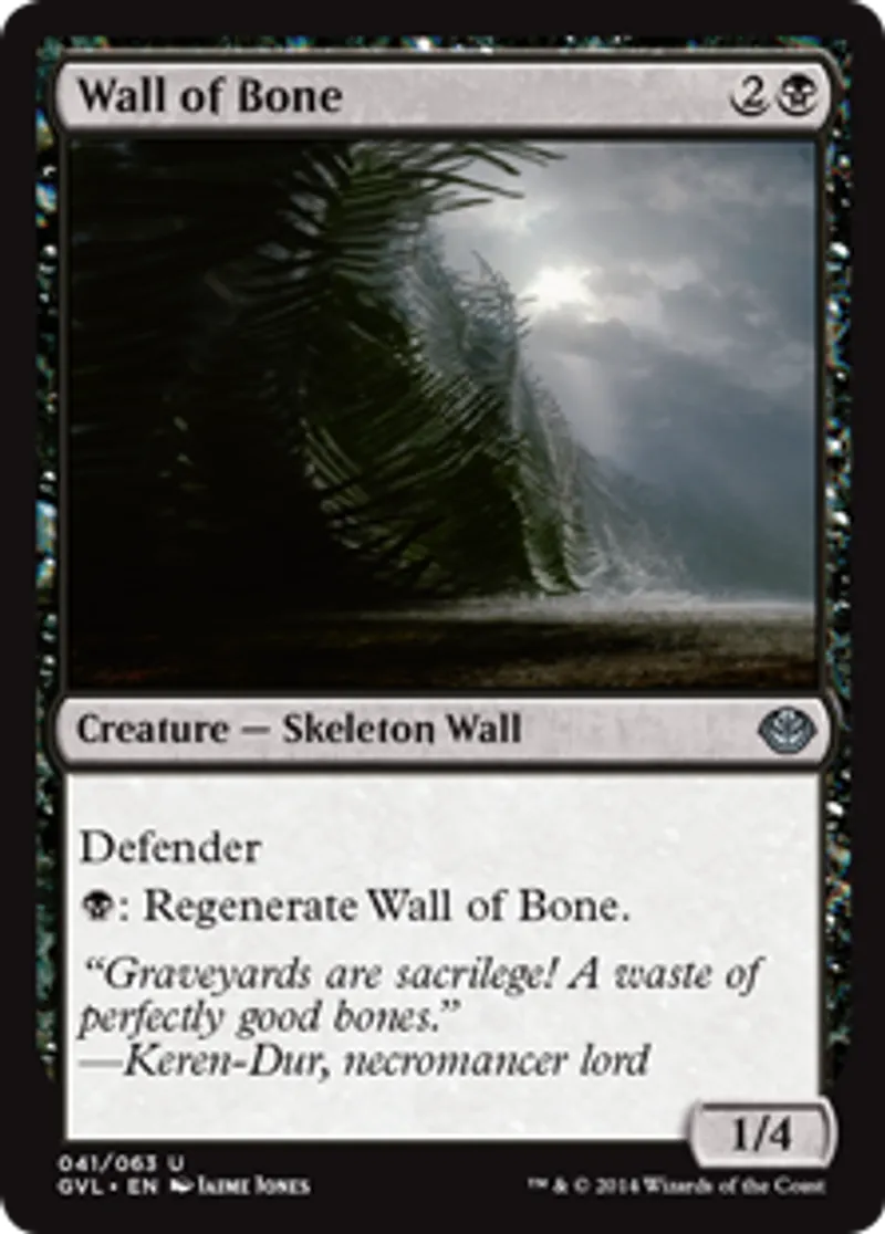 | Oracle Text | Defender (This creature can't attack.) {{b}}: Regenerate Wall of Bone. (The next time this creature would be destroyed this turn, it isn't. Instead tap it, remove all damage from it, and remove it from combat.) | ||
