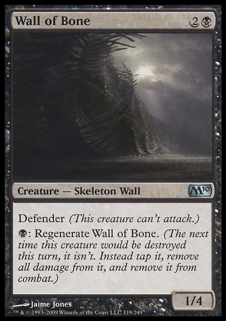 | Oracle Text | Defender (This creature can't attack.) {{b}}: Regenerate Wall of Bone. (The next time this creature would be destroyed this turn, it isn't. Instead tap it, remove all damage from it, and remove it from combat.) | ||