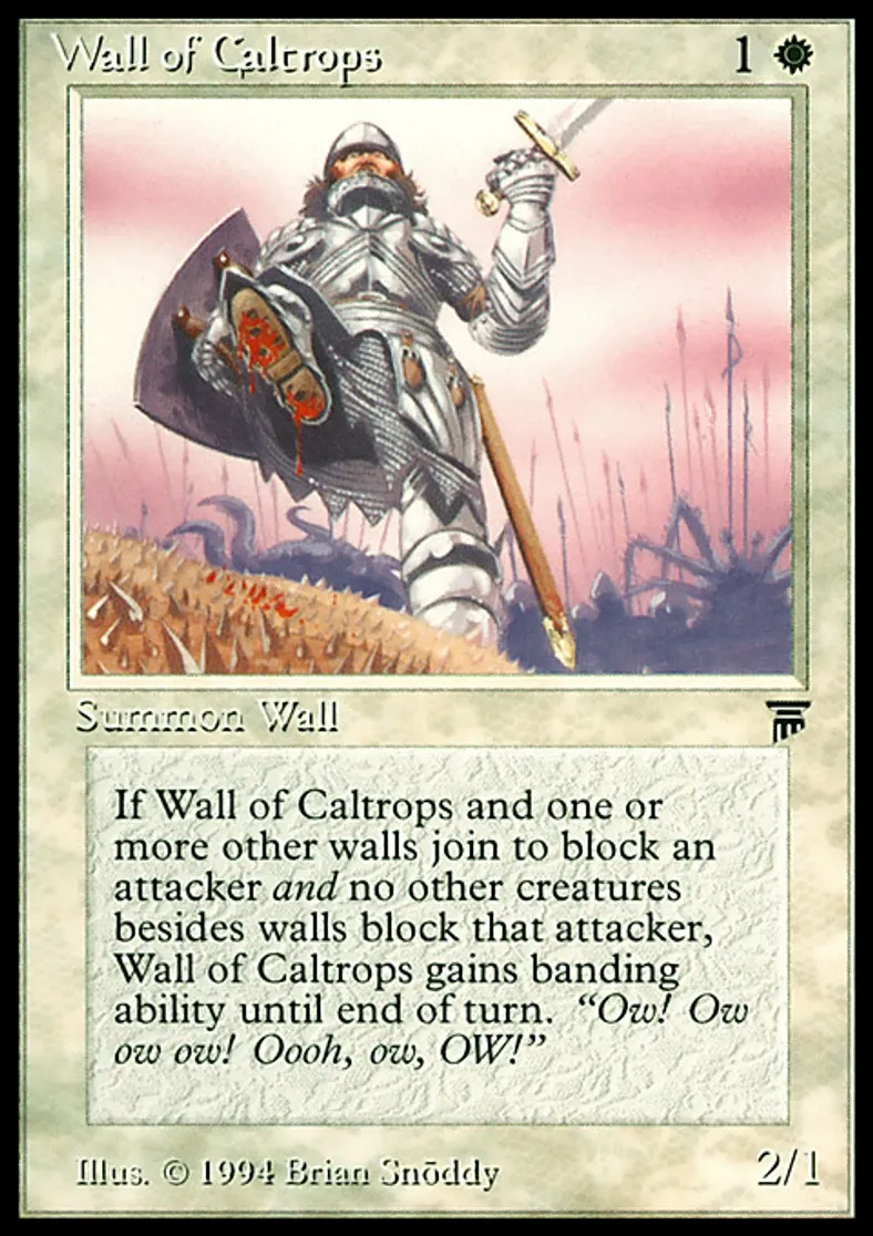 | Oracle Text | Defender (This creature can't attack.) Whenever Wall of Caltrops blocks a creature, if no non-Wall creatures are blocking that creature, Wall of Caltrops gains banding until end of turn. (If any creatures with banding you control are blocking a creature, you divide that creature's combat damage, not its controller, among any of the creatures it's being blocked by.) | ||