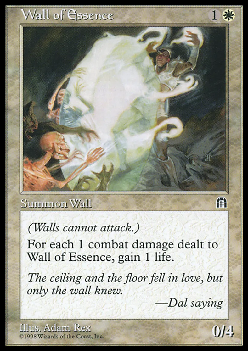 | Oracle Text | Defender (This creature can't attack.) Whenever Wall of Essence is dealt combat damage, you gain that much life. | ||