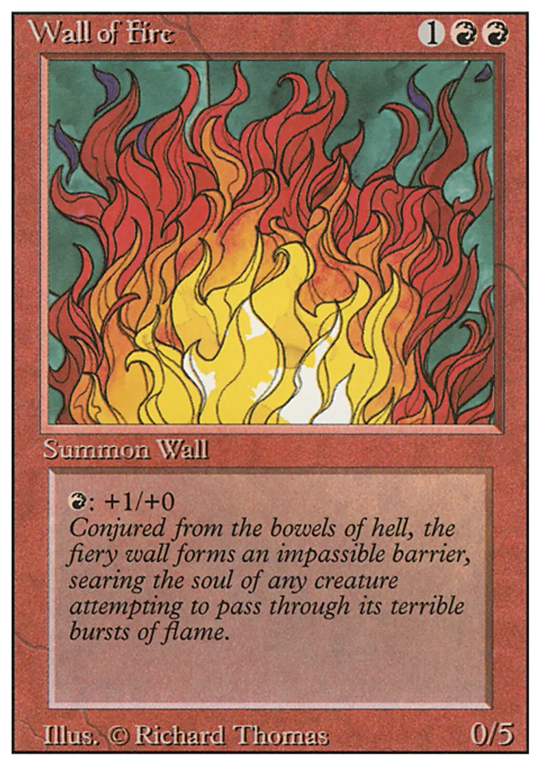 | Flavor Text | Conjured from the bowels of hell, the fiery wall forms an impassable barrier, searing the soul of any creature attempting to pass through its terrible bursts of flame. | ||