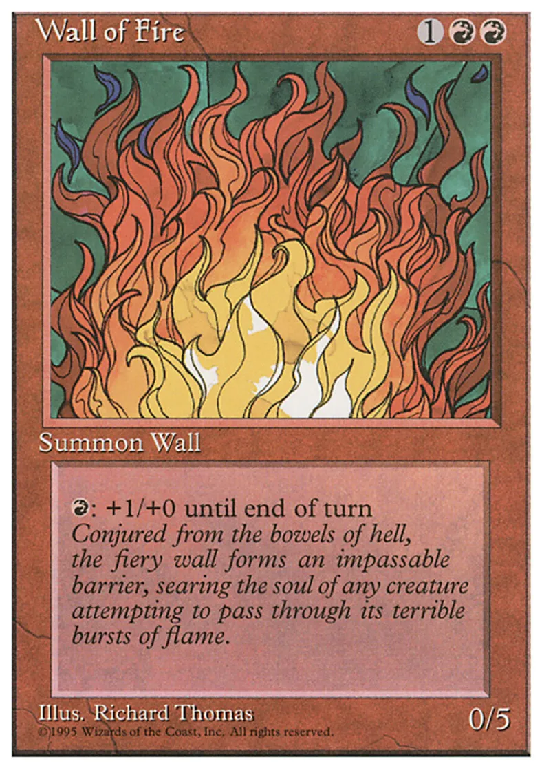 | Flavor Text | Conjured from the bowels of hell, the fiery wall forms an impassable barrier, searing the soul of any creature attempting to pass through its terrible bursts of flame. | ||