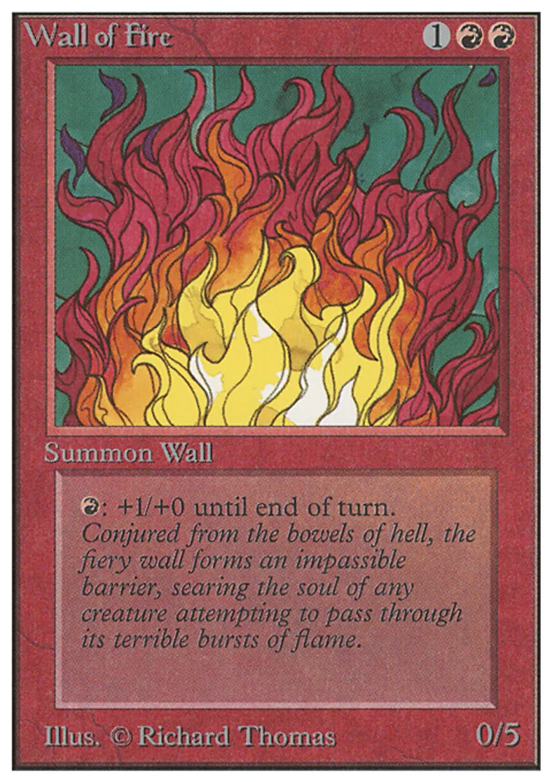 | Flavor Text | Conjured from the bowels of hell, the fiery wall forms an impassable barrier, searing the soul of any creature attempting to pass through its terrible bursts of flame. | ||