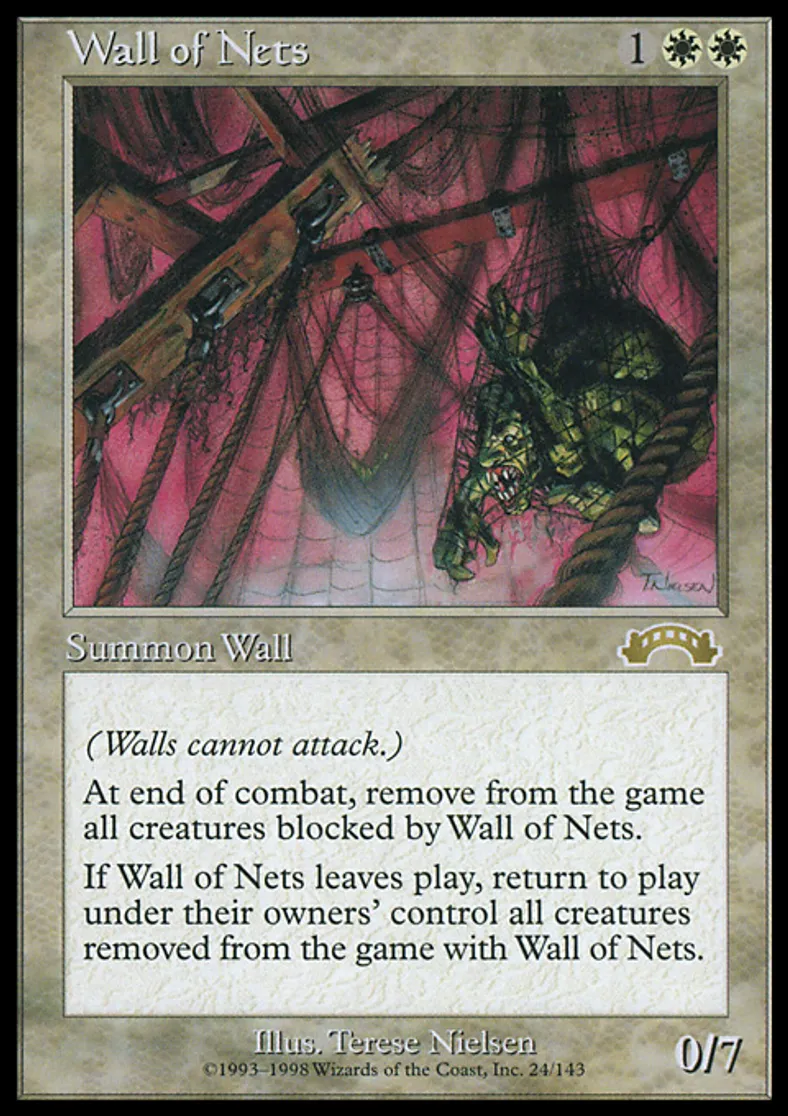 | Oracle Text | Defender (This creature can't attack.) At end of combat, exile all creatures blocked by Wall of Nets. When Wall of Nets leaves the battlefield, return all cards exiled with Wall of Nets to the battlefield under their owners' control. | ||