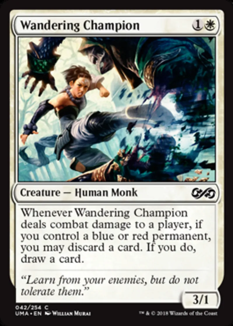 | Oracle Text | Whenever Wandering Champion deals combat damage to a player, if you control a blue or red permanent, you may discard a card. If you do, draw a card. | ||