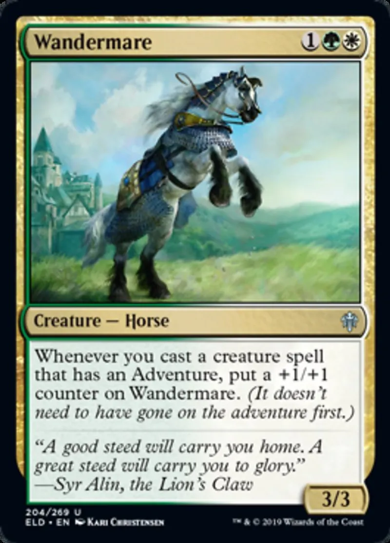 | Oracle Text | Whenever you cast a creature spell that has an Adventure, put a +1/+1 counter on Wandermare. (It doesn't need to have gone on the adventure first.) | ||