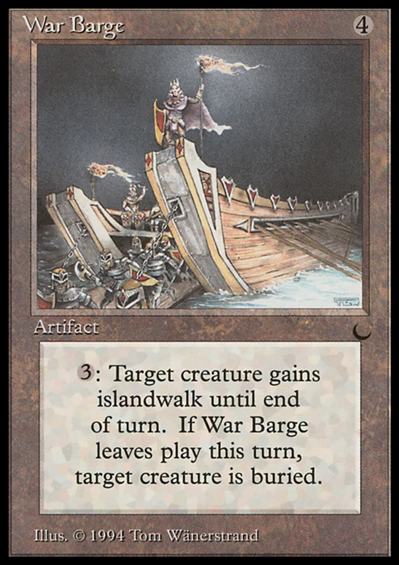 | Oracle Text | {{3}}: Target creature gains islandwalk until end of turn. When War Barge leaves the battlefield this turn, destroy that creature. A creature destroyed this way can't be regenerated. | ||