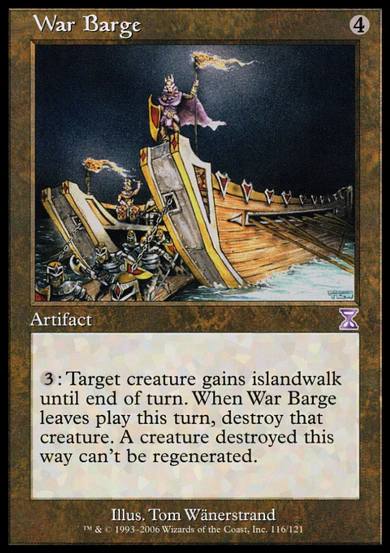 | Oracle Text | {{3}}: Target creature gains islandwalk until end of turn. When War Barge leaves the battlefield this turn, destroy that creature. A creature destroyed this way can't be regenerated. | ||