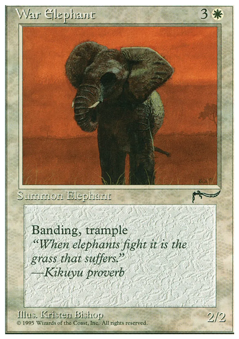 | Flavor Text | "When elephants fight it is the grass that suffers."—Kikuyu proverb | ||