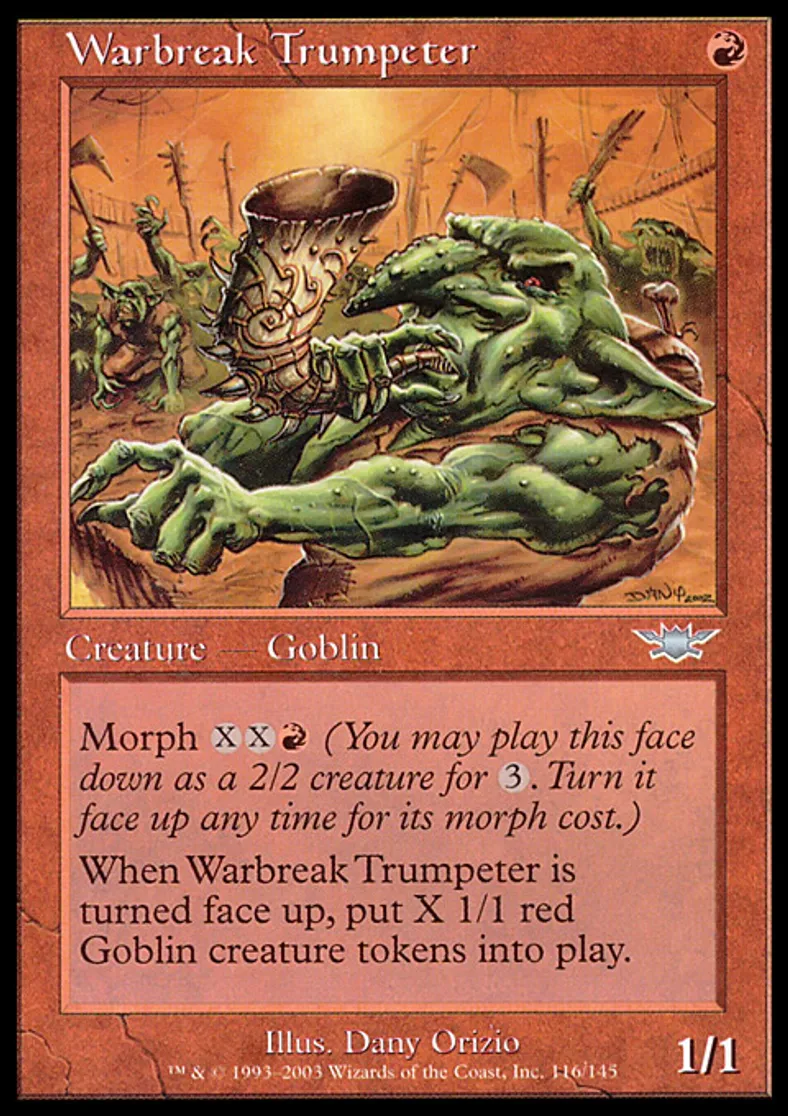 | Oracle Text | Morph {{x}}{{x}}{{r}} (You may cast this face down as a 2/2 creature for {{3}}. Turn it face up any time for its morph cost.) When Warbreak Trumpeter is turned face up, put X 1/1 red Goblin creature tokens onto the battlefield. | ||
