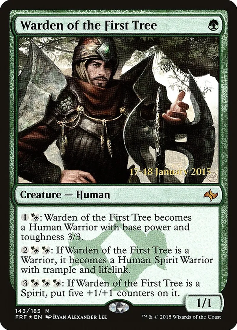 Magic: the Gathering (mtg) Mythic Rare Creature - Human Warden of the First Tree from Prerelease Cards (pPRE) last updated 2026-02-21 17:01:02