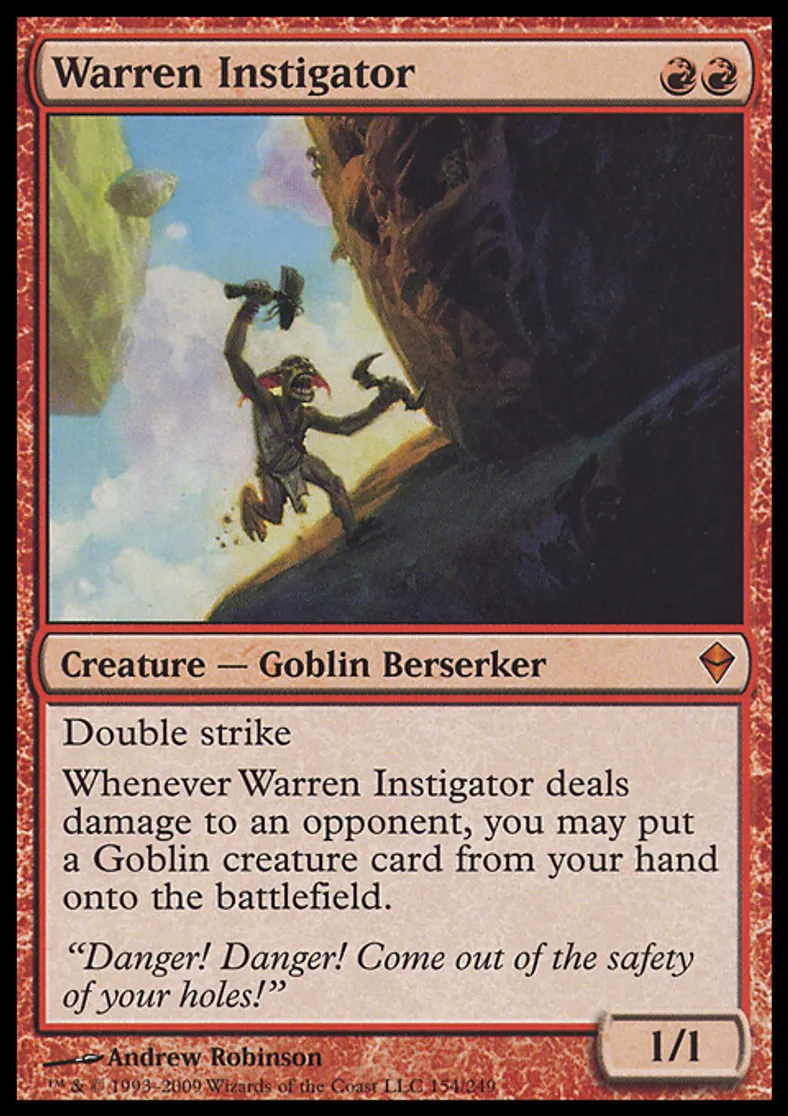 | Oracle Text | Double strike Whenever Warren Instigator deals damage to an opponent, you may put a Goblin creature card from your hand onto the battlefield. | ||