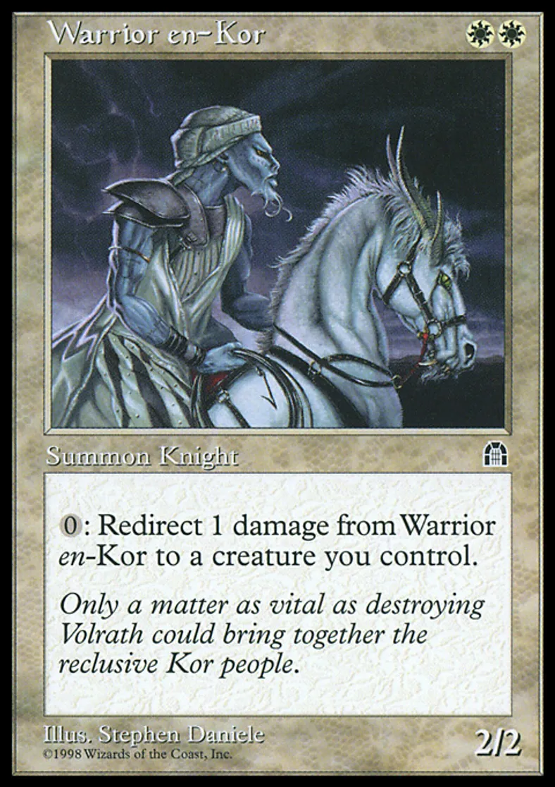 | Oracle Text | {{0}}: The next 1 damage that would be dealt to Warrior en-Kor this turn is dealt to target creature you control instead. | ||