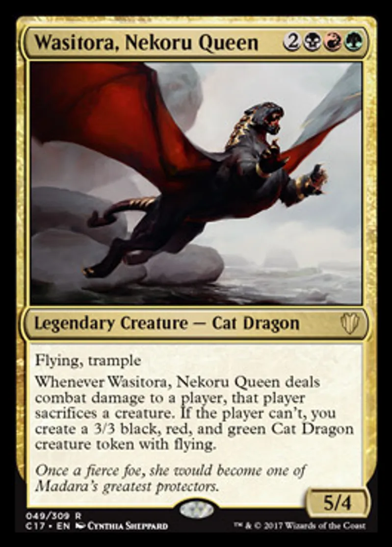 | Oracle Text | Flying, trample Whenever Wasitora, Nekoru Queen deals combat damage to a player, that player sacrifices a creature. If the player can't, you create a 3/3 black, red, and green Cat Dragon creature token with flying. | ||
