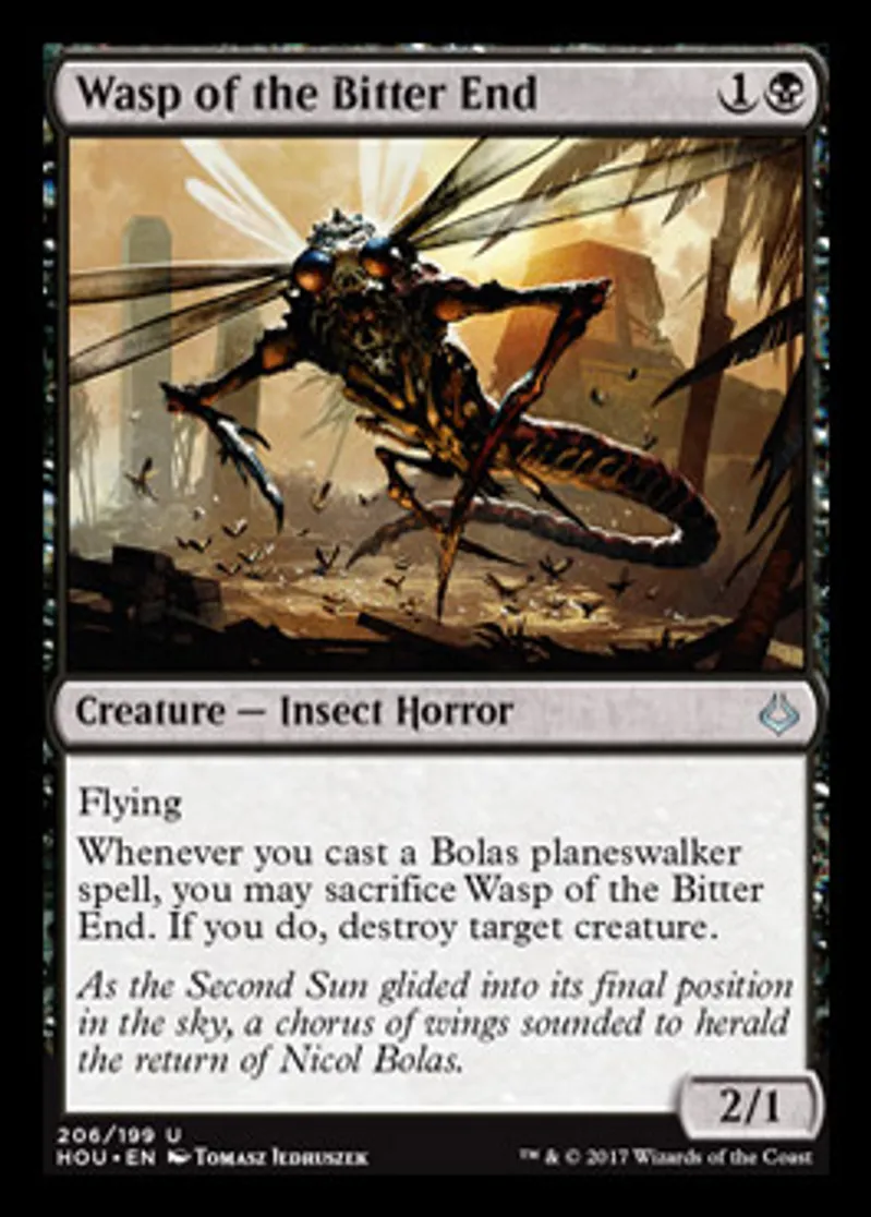 | Oracle Text | Flying Whenever you cast a Bolas planeswalker spell, you may sacrifice Wasp of the Bitter End. If you do, destroy target creature. | ||