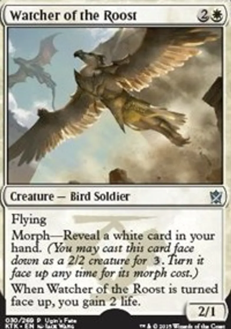 | Oracle Text | Flying Morph—Reveal a white card in your hand. (You may cast this card face down as a 2/2 creature for {{3}}. Turn it face up any time for its morph cost.) When Watcher of the Roost is turned face up, you gain 2 life. | ||