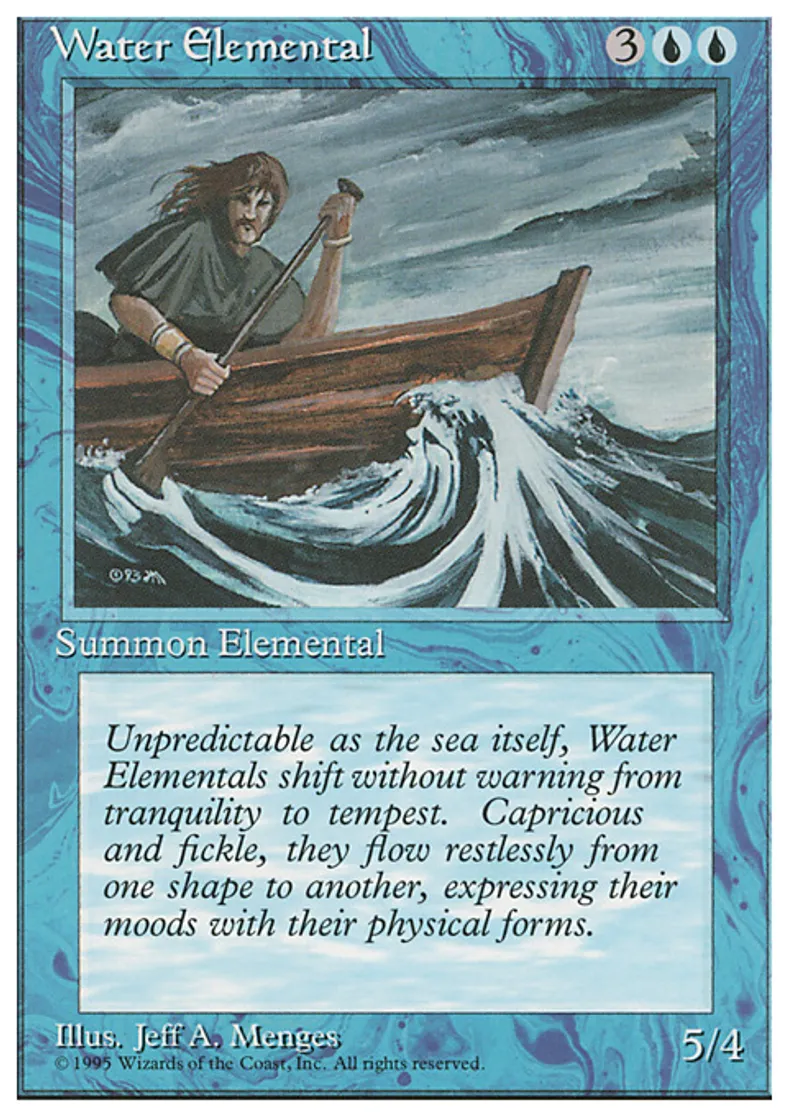 | Flavor Text | Unpredictable as the sea itself, Water Elementals shift without warning from tranquility to tempest. Capricious and fickle, they flow restlessly from one shape to another, expressing their moods with their physical forms. | ||