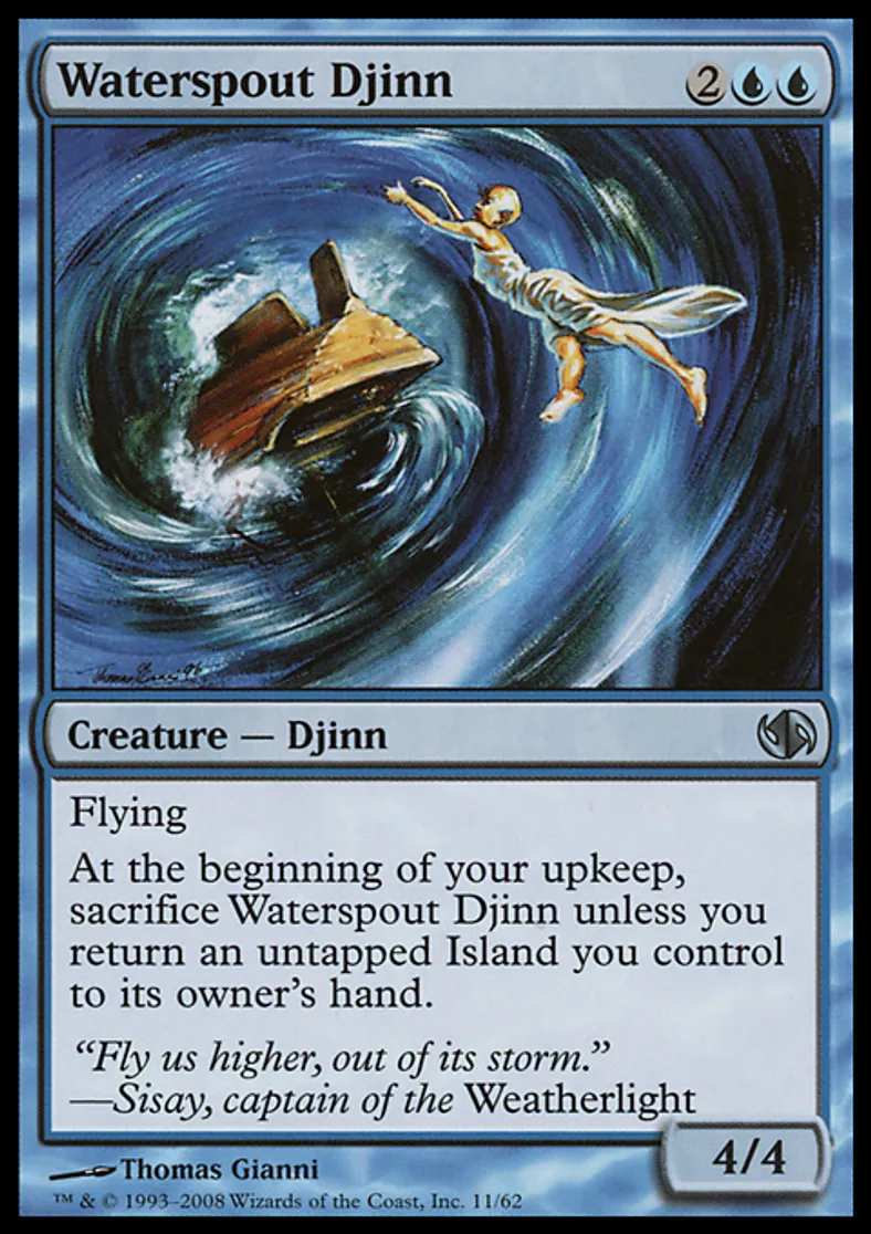 | Oracle Text | Flying At the beginning of your upkeep, sacrifice Waterspout Djinn unless you return an untapped Island you control to its owner's hand. | ||