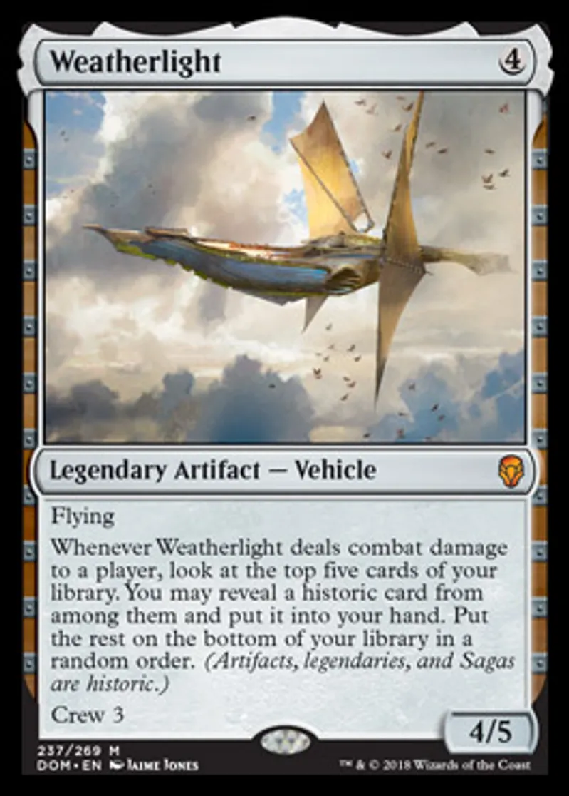 | Oracle Text | Flying Whenever Weatherlight deals combat damage to a player, look at the top five cards of your library. You may reveal a historic card from among them and put it into your hand. Put the rest on the bottom of your library in a random order. (Artifacts, legendaries, and Sagas are historic.) Crew 3 | ||