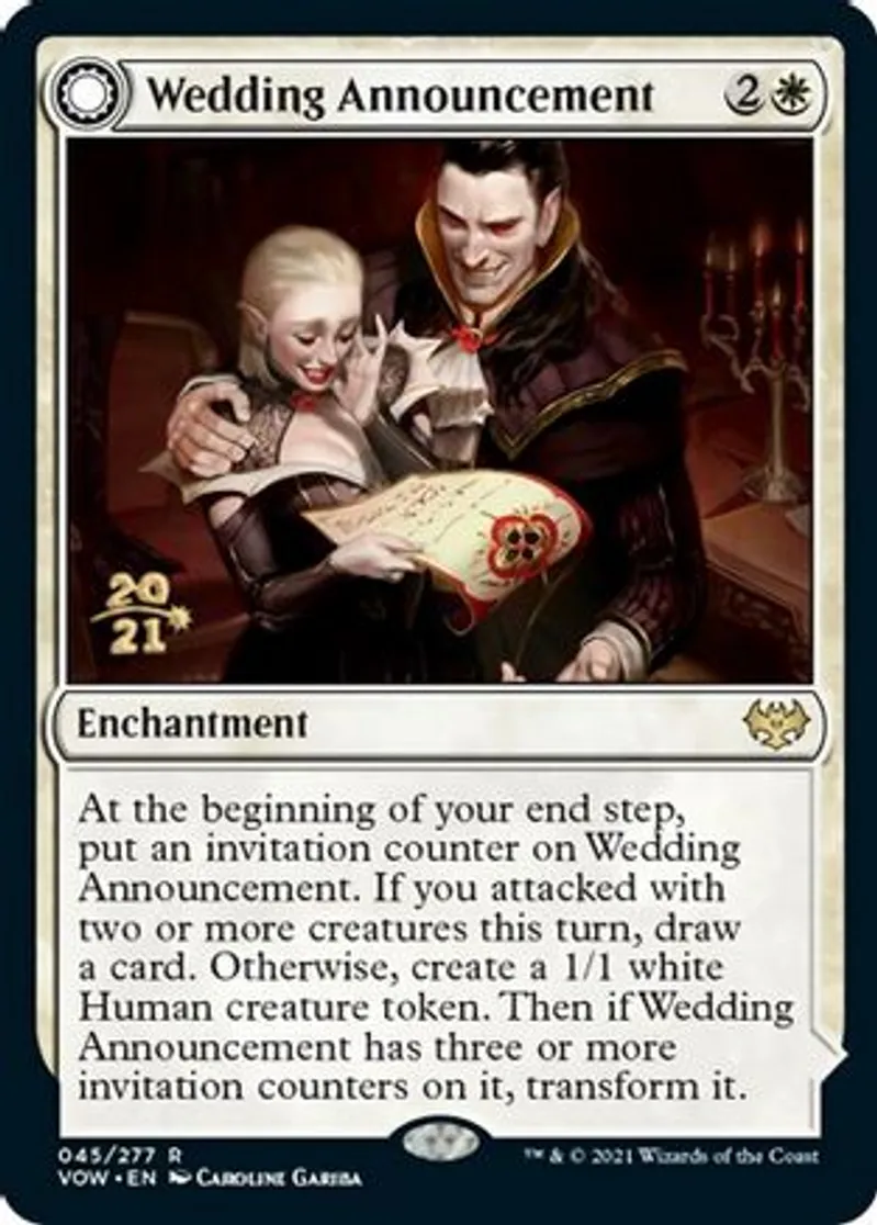 | Oracle Text | At the beginning of your end step, put an invitation counter on Wedding Announcement. If you attacked with two or more creatures this turn, draw card. Otherwise, create a 1/1 white Human creature token. Then if Wedding Announcement has three or more invitation counters on it, transform it.