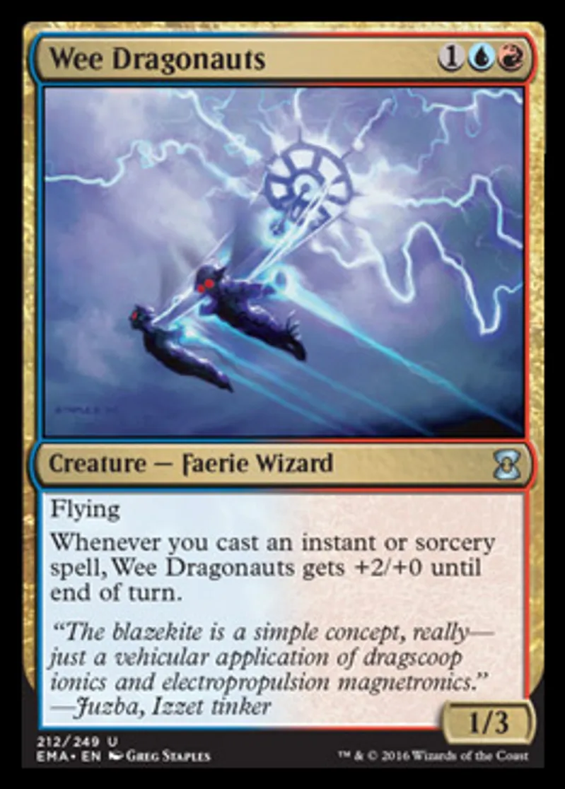 | Oracle Text | Flying Whenever you cast an instant or sorcery spell, Wee Dragonauts gets +2/+0 until end of turn. | ||