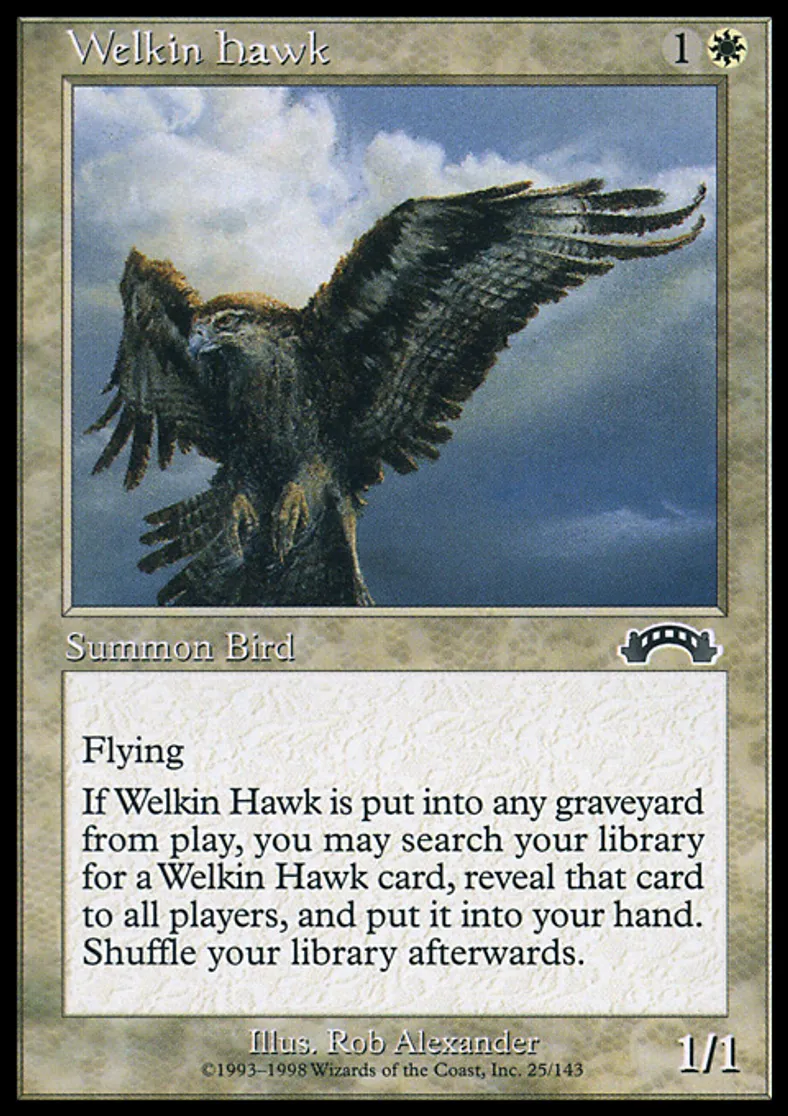 | Oracle Text | Flying When Welkin Hawk dies, you may search your library for a card named Welkin Hawk, reveal that card, put it into your hand, then shuffle your library. | ||