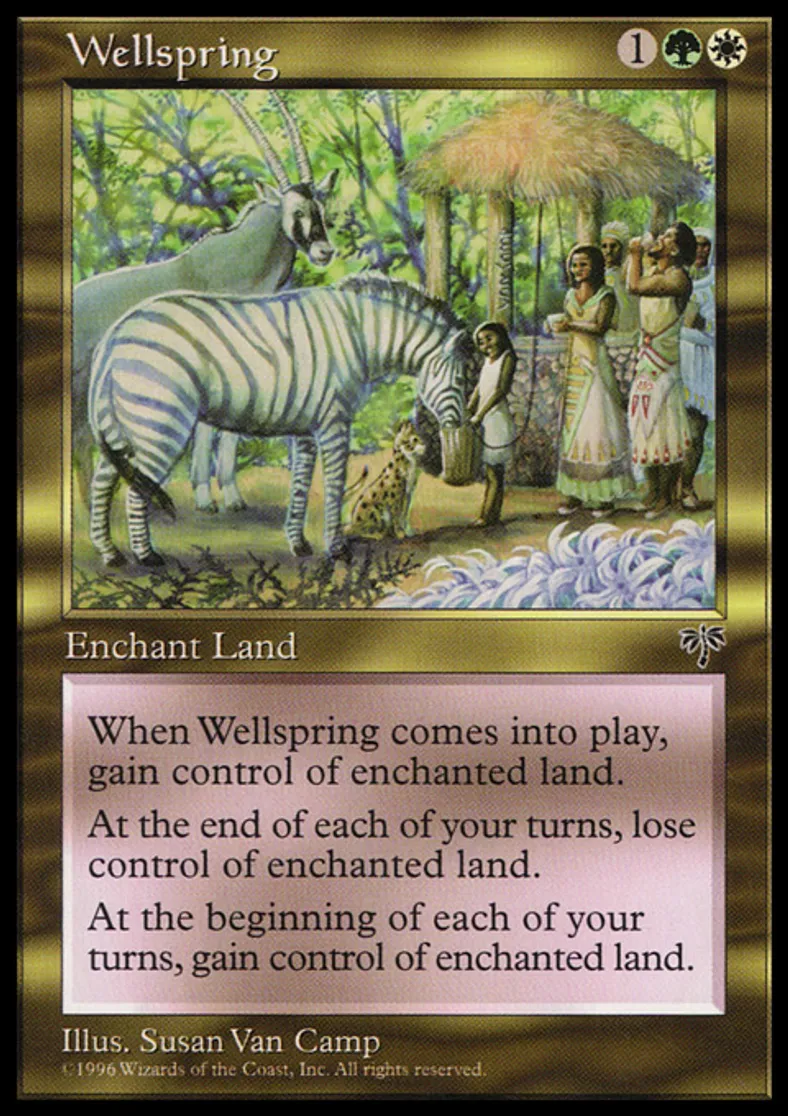 | Oracle Text | Enchant land When Wellspring enters the battlefield, gain control of enchanted land until end of turn. At the beginning of your upkeep, untap enchanted land. You gain control of that land until end of turn. | ||