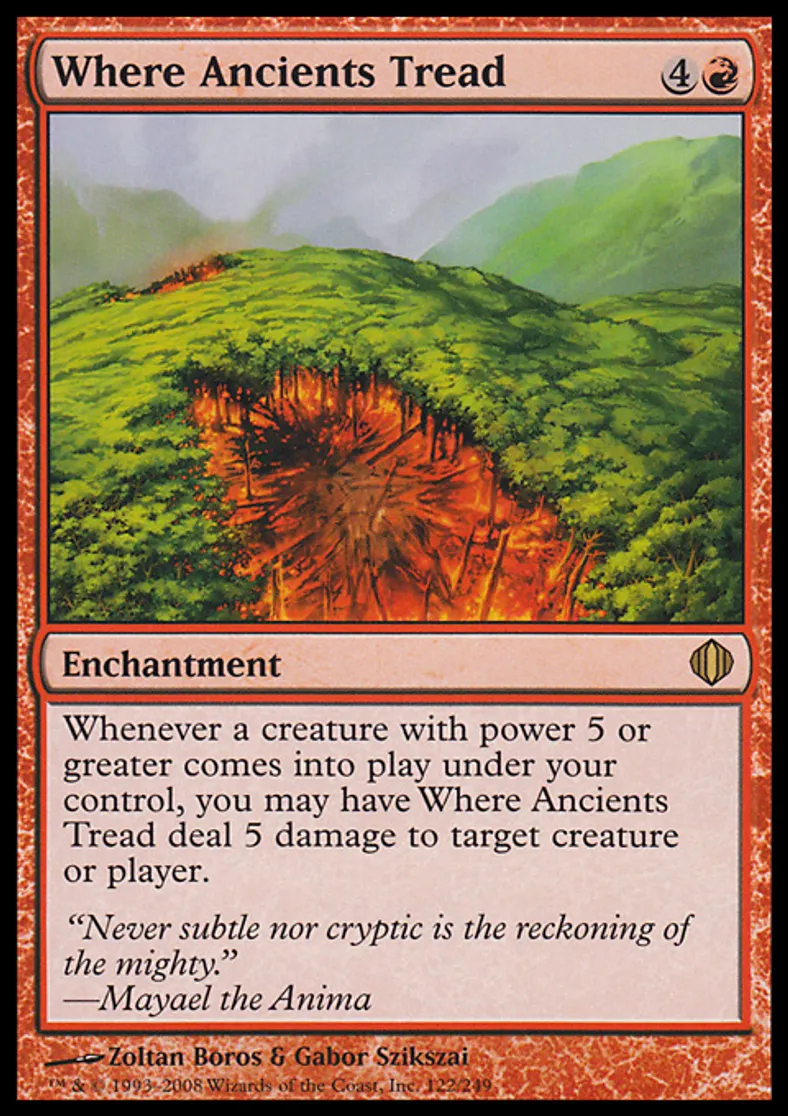 | Oracle Text | Whenever a creature with power 5 or greater enters the battlefield under your control, you may have Where Ancients Tread deal 5 damage to target creature or player. | ||