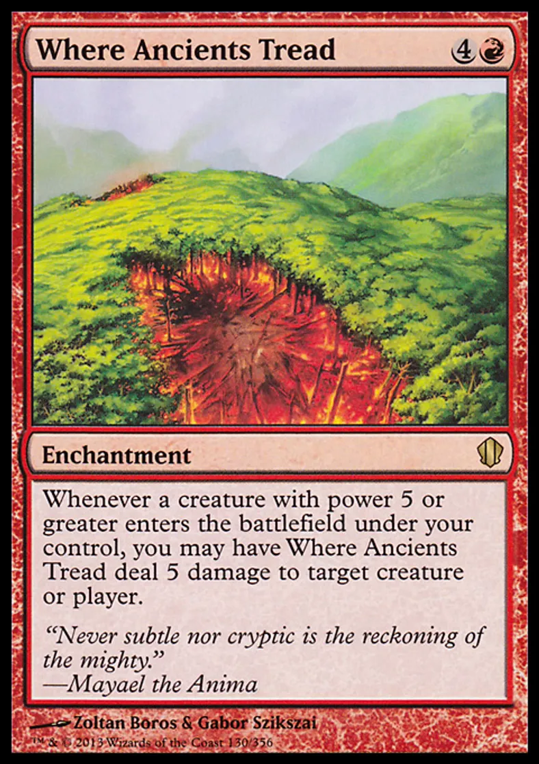 | Oracle Text | Whenever a creature with power 5 or greater enters the battlefield under your control, you may have Where Ancients Tread deal 5 damage to target creature or player. | ||