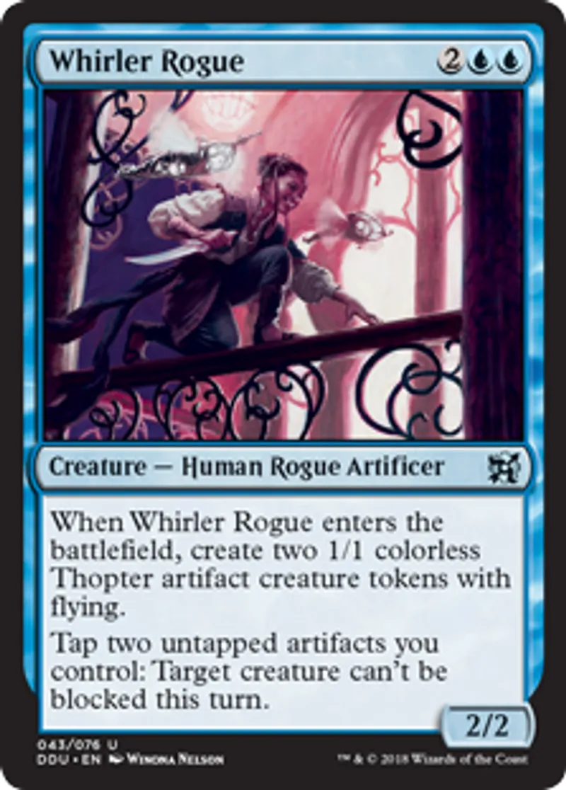 | Oracle Text | When Whirler Rogue enters the battlefield, create two 1/1 colorless Thopter artifact creature tokens with flying. Tap two untapped artifacts you control: Target creature can't be blocked this turn. | ||