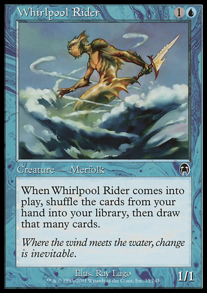 | Oracle Text | When Whirlpool Rider enters the battlefield, shuffle the cards from your hand into your library, then draw that many cards. | ||