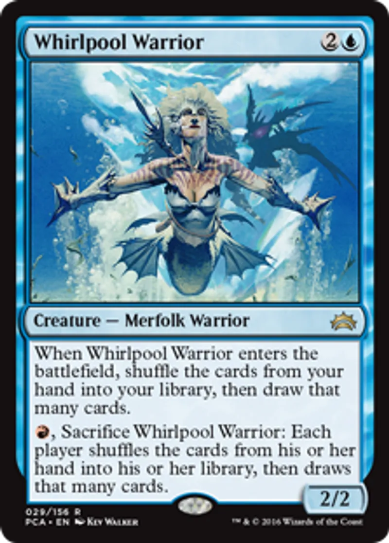 | Oracle Text | When Whirlpool Warrior enters the battlefield, shuffle the cards from your hand into your library, then draw that many cards. {{r}}, Sacrifice Whirlpool Warrior: Each player shuffles the cards from his or her hand into his or her library, then draws that many cards. | ||