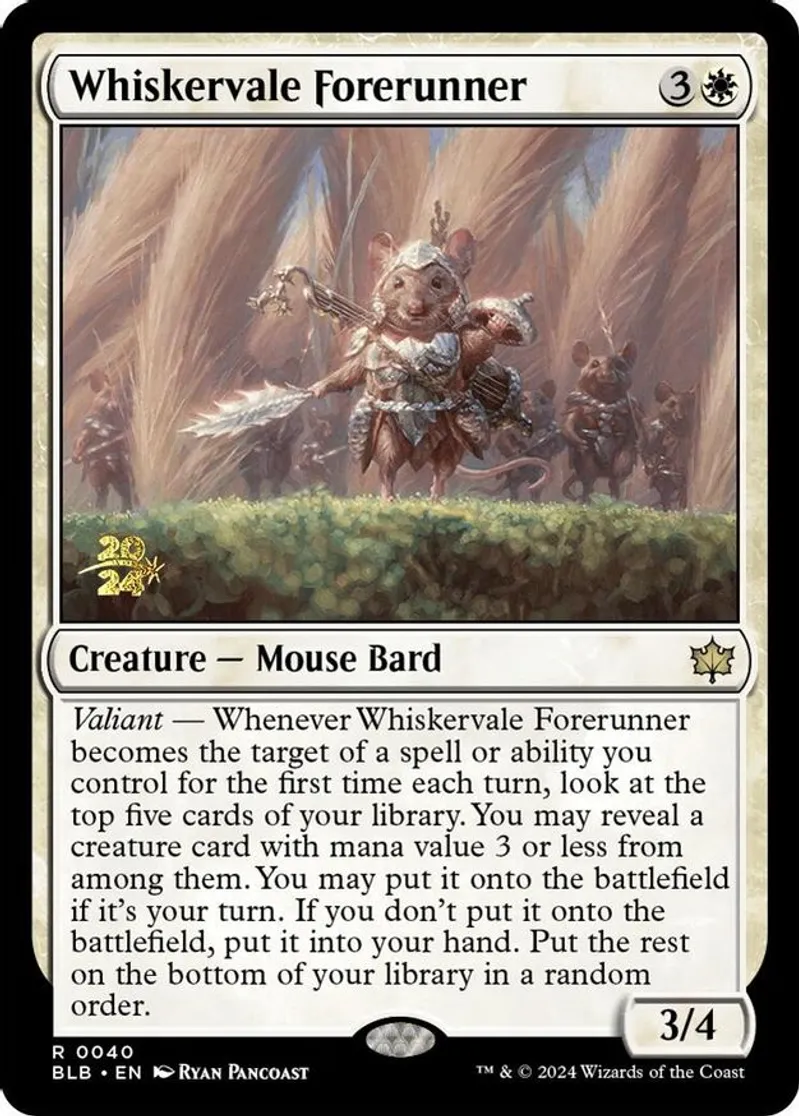 Magic: the Gathering (mtg) Rare creature — mouse bard Whiskervale Forerunner from Prerelease Cards (pPRE) last updated 2026-02-21 15:29:36