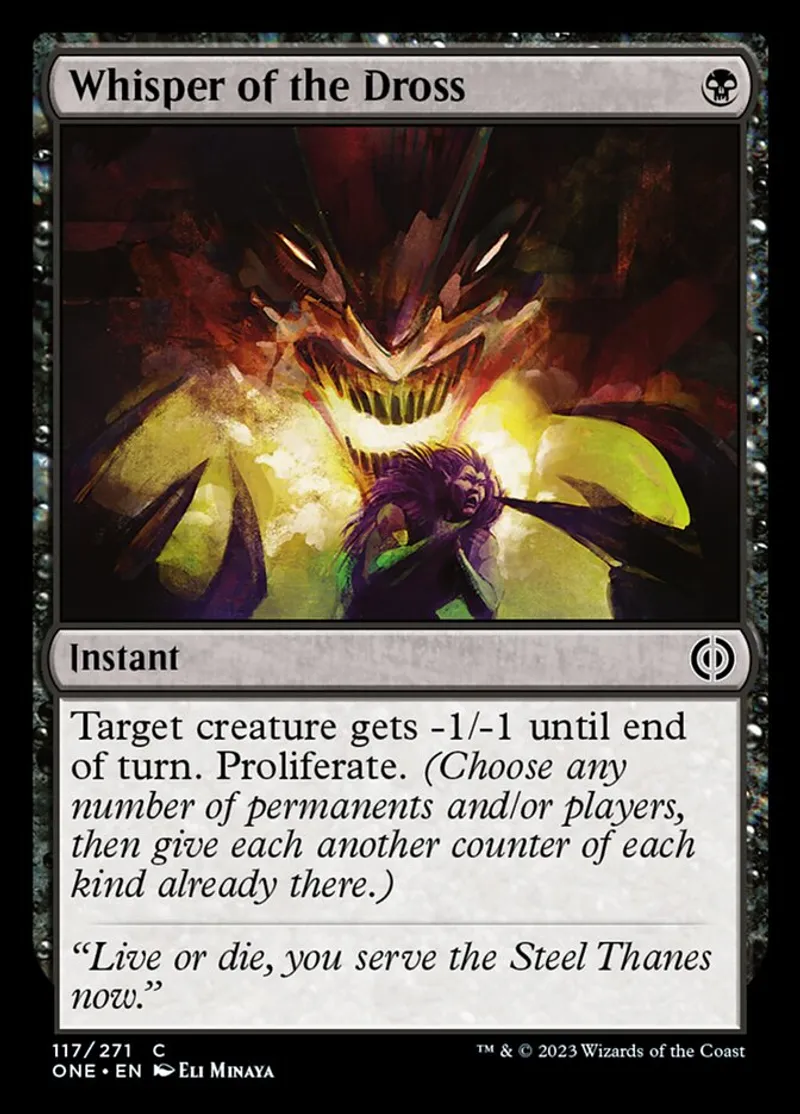 Whisper of the Dross is a common in the set Phyrexia: All Will Be One.