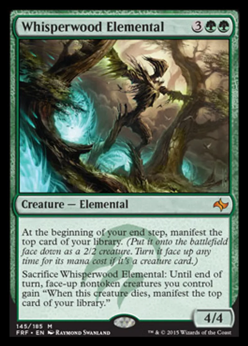 Sacrifice Whisperwood Elemental: Until end of turn, face-up nontoken creatures you control gain "When this creature dies, manifest the top card of your library." | ||