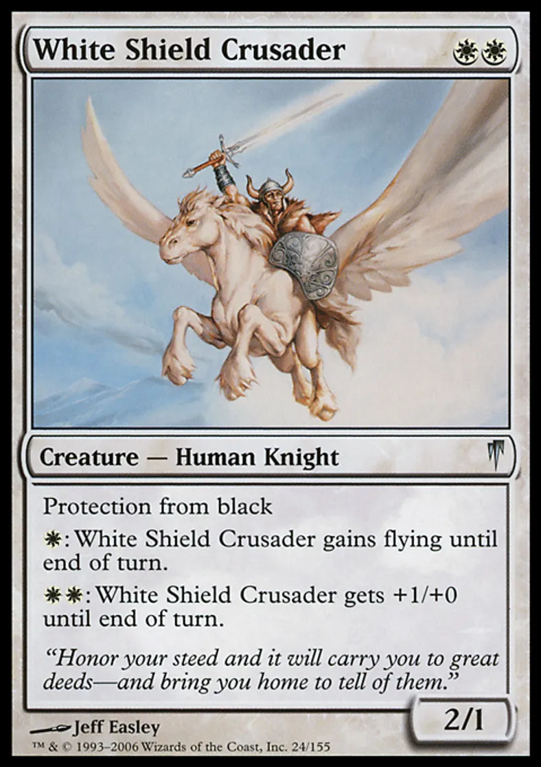 | Oracle Text | Protection from black {{w}}: White Shield Crusader gains flying until end of turn. {{w}}{{w}}: White Shield Crusader gets +1/+0 until end of turn. | ||