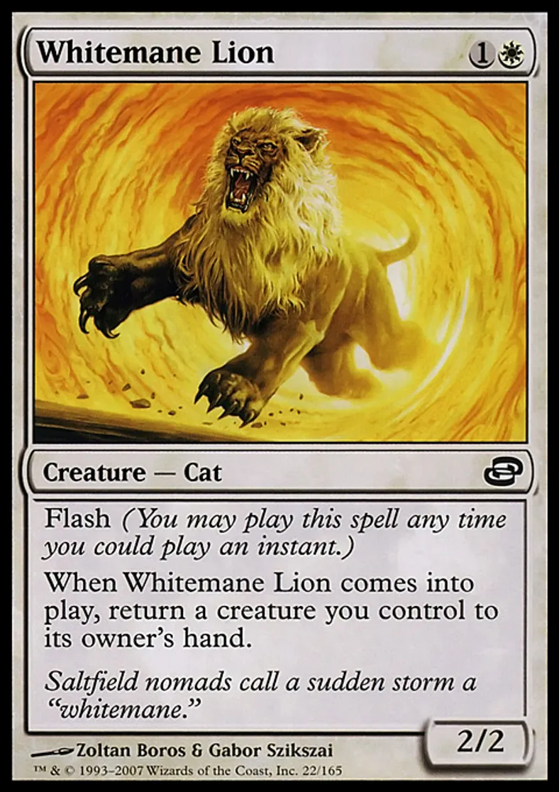 | Oracle Text | Flash (You may cast this spell any time you could cast an instant.) When Whitemane Lion enters the battlefield, return a creature you control to its owner's hand. | ||