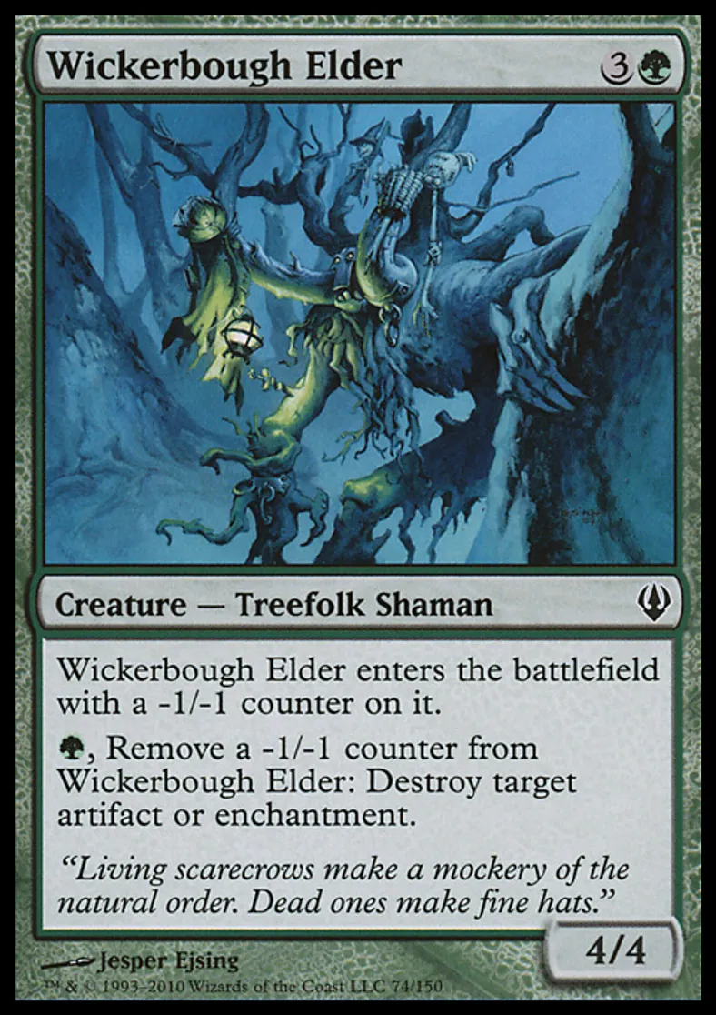 | Oracle Text | Wickerbough Elder enters the battlefield with a -1/-1 counter on it. {{g}}, Remove a -1/-1 counter from Wickerbough Elder: Destroy target artifact or enchantment. | ||