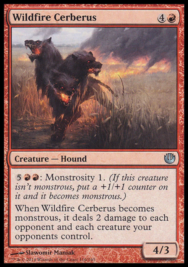 | Oracle Text | {{5}}{{r}}{{r}}: Monstrosity 1. (If this creature isn't monstrous, put a +1/+1 counter on it and it becomes monstrous.) When Wildfire Cerberus becomes monstrous, it deals 2 damage to each opponent and each creature your opponents control. | ||