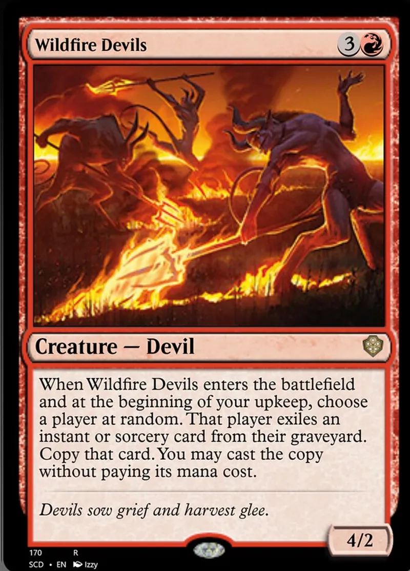 | Oracle Text | When Wildfire Devils enters the battlefield and at the beginning of your upkeep, choose a player at random. That player exiles an instant or sorcery card from their graveyard. Copy that card. You may cast the copy without paying its mana cost. | ||
