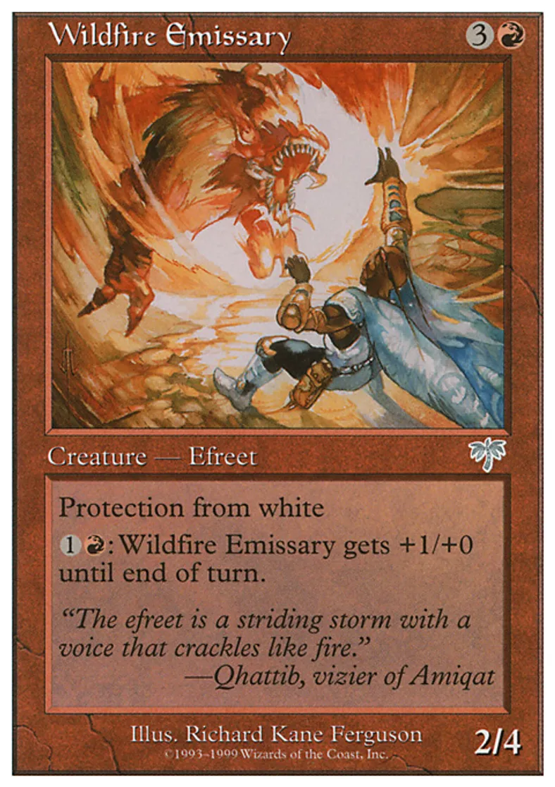 | Oracle Text | Protection from white {{1}}{{r}}: Wildfire Emissary gets +1/+0 until end of turn. | ||