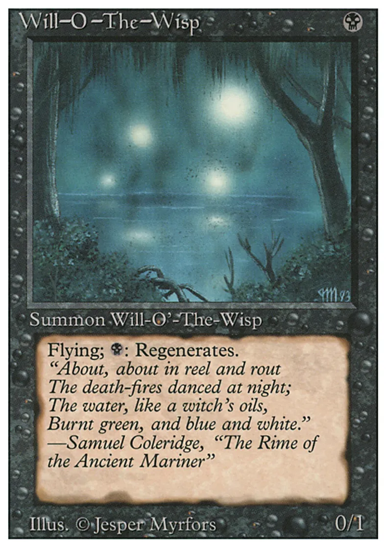 | Oracle Text | Flying (This creature can't be blocked except by creatures with flying or reach.) {{b}}: Regenerate Will-o'-the-Wisp. (The next time this creature would be destroyed this turn, it isn't. Instead tap it, remove all damage from it, and remove it from combat.) | ||