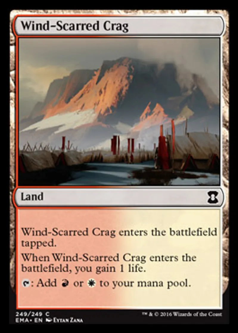 | Oracle Text | Wind-Scarred Crag enters the battlefield tapped. When Wind-Scarred Crag enters the battlefield, you gain 1 life. {{t}}: Add {{r}} or {{w}} to your mana pool. | ||
