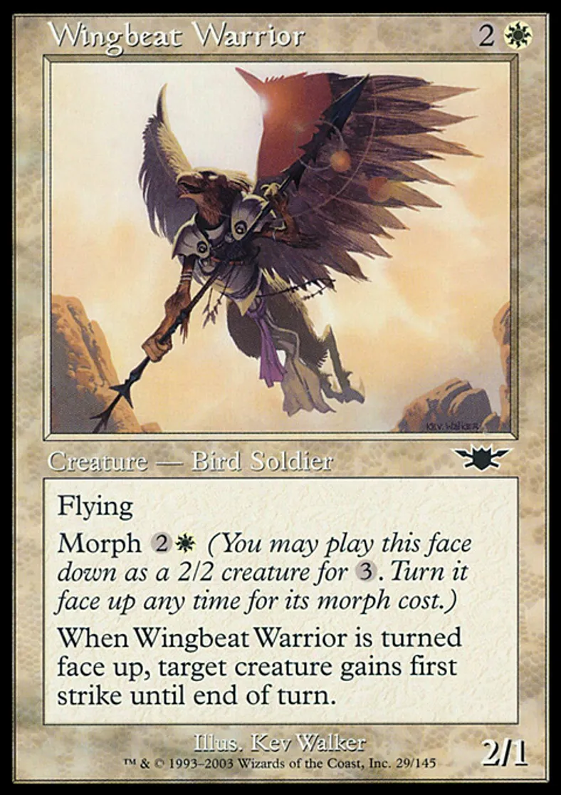 | Oracle Text | Flying Morph {{2}}{{w}} (You may cast this face down as a 2/2 creature for {{3}}. Turn it face up any time for its morph cost.) When Wingbeat Warrior is turned face up, target creature gains first strike until end of turn. | ||