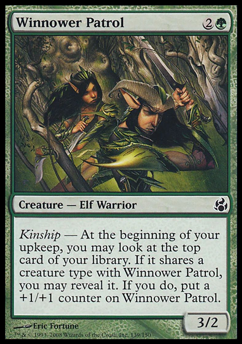 | Oracle Text | Kinship — At the beginning of your upkeep, you may look at the top card of your library. If it shares a creature type with Winnower Patrol, you may reveal it. If you do, put a +1/+1 counter on Winnower Patrol. | ||