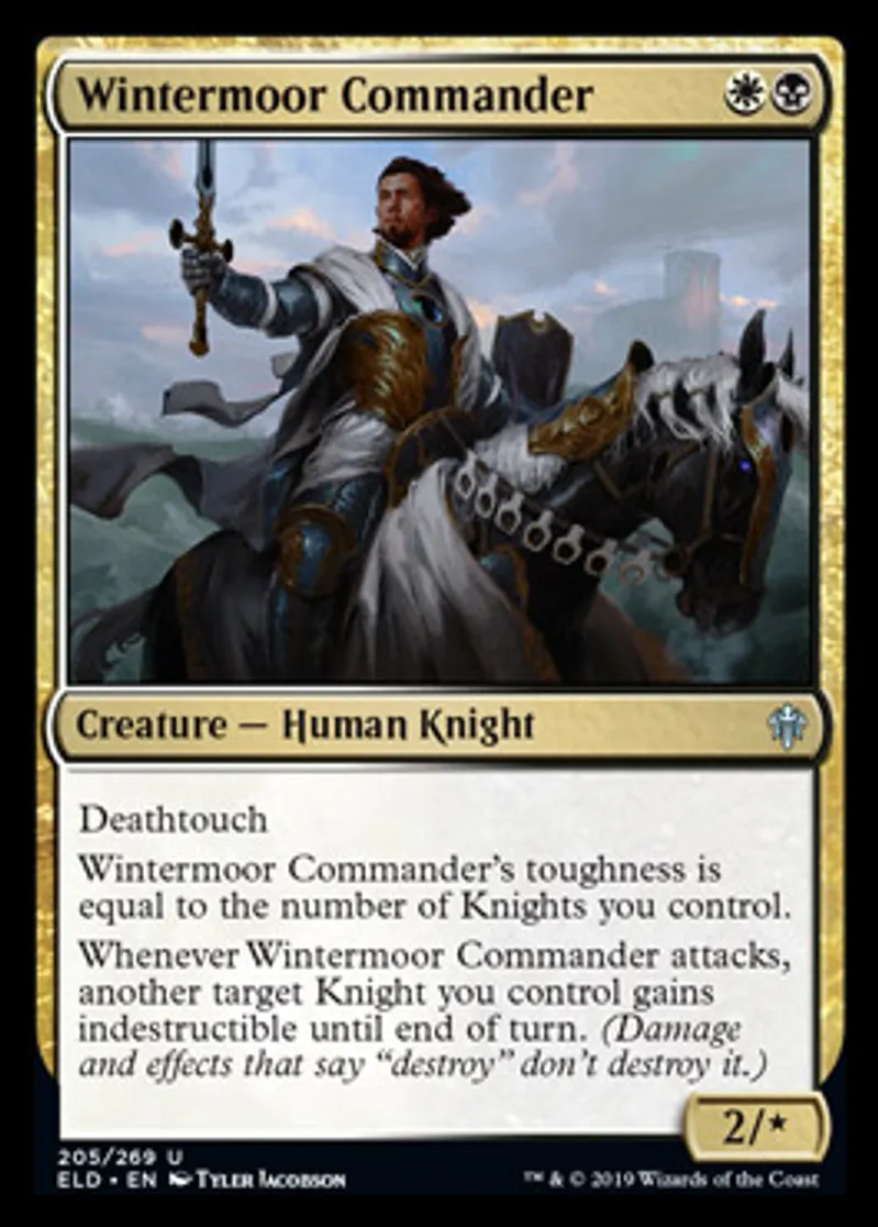 | Oracle Text | Deathtouch\r\n\r\nWintermoor Commander\'s toughness is equal to the number of Knights you control.\r\n\r\nWhenever Wintermoor Commander attacks, another target Knight you control gains indestructible until end of turn. (Damage and effects that say \"destroy\" don\'t destroy it.\") | ||