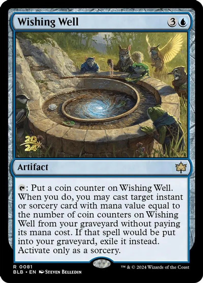 | Oracle Text | t: put a coin counter on wishing well. when you do, you may cast target instant or sorcery card with mana value equal to the number of coin counters on wishing well from your graveyard without paying its mana cost. if that spell would be put into your graveyard, exile it instead. activate only as a sorcery. | ||
