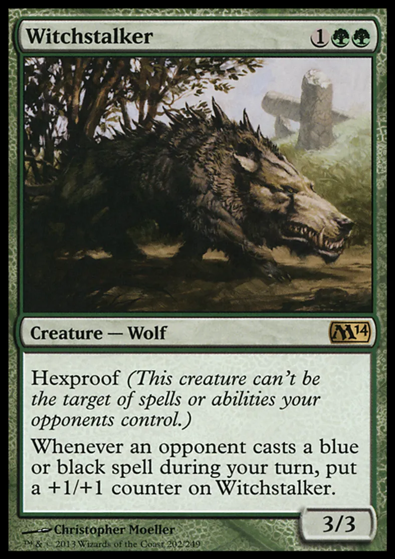 | Oracle Text | Hexproof (This creature can't be the target of spells or abilities your opponents control.) Whenever an opponent casts a blue or black spell during your turn, put a +1/+1 counter on Witchstalker. | ||