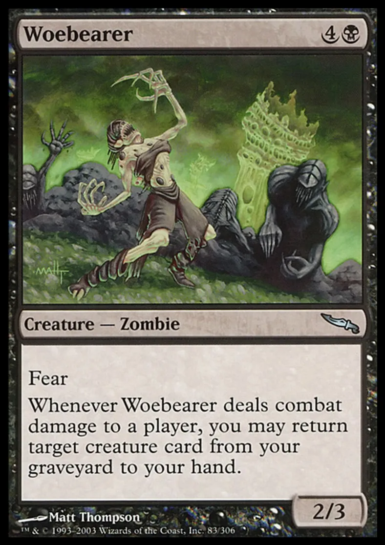| Oracle Text | Fear (This creature can't be blocked except by artifact creatures and/or black creatures.) Whenever Woebearer deals combat damage to a player, you may return target creature card from your graveyard to your hand. | ||